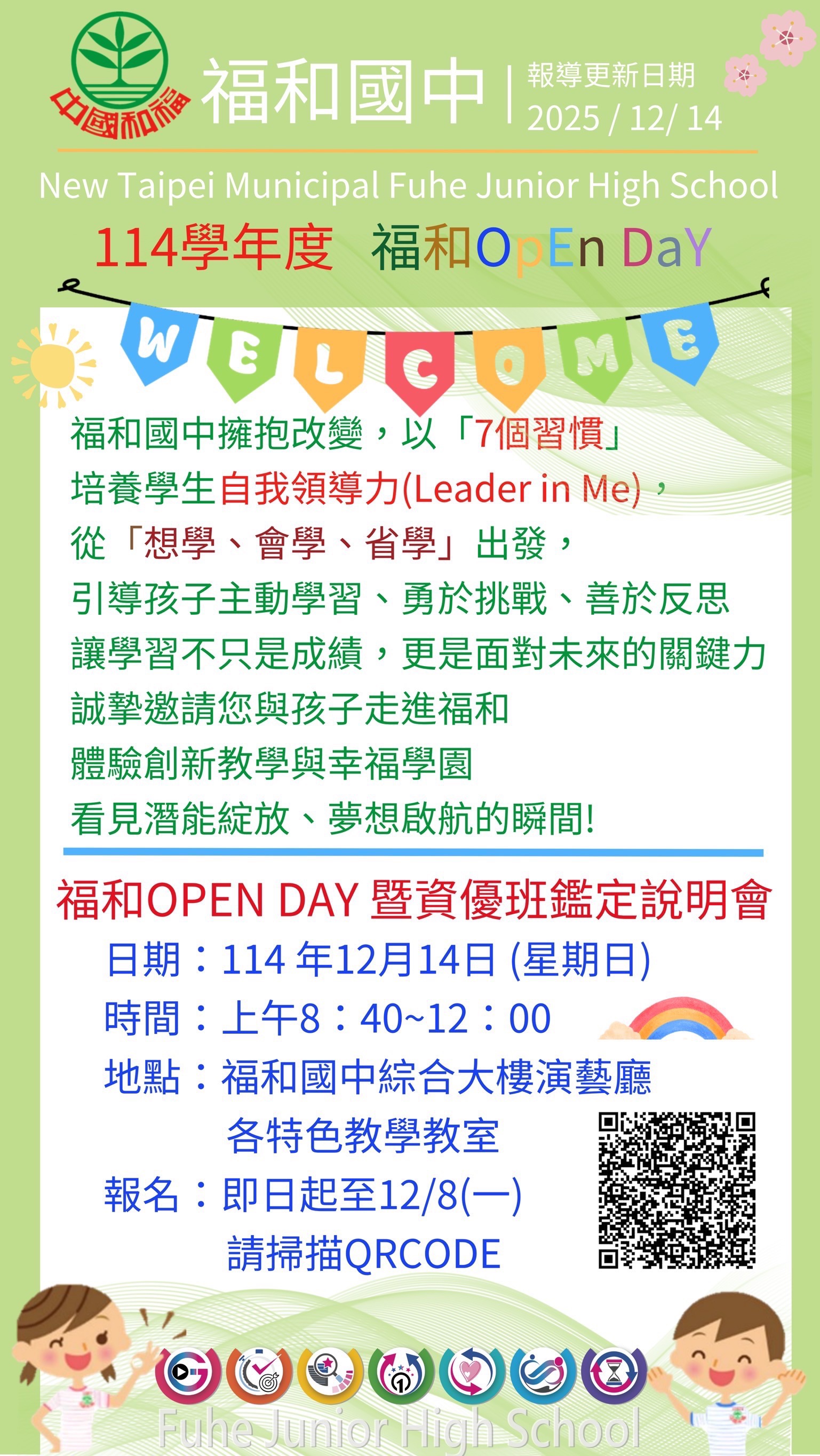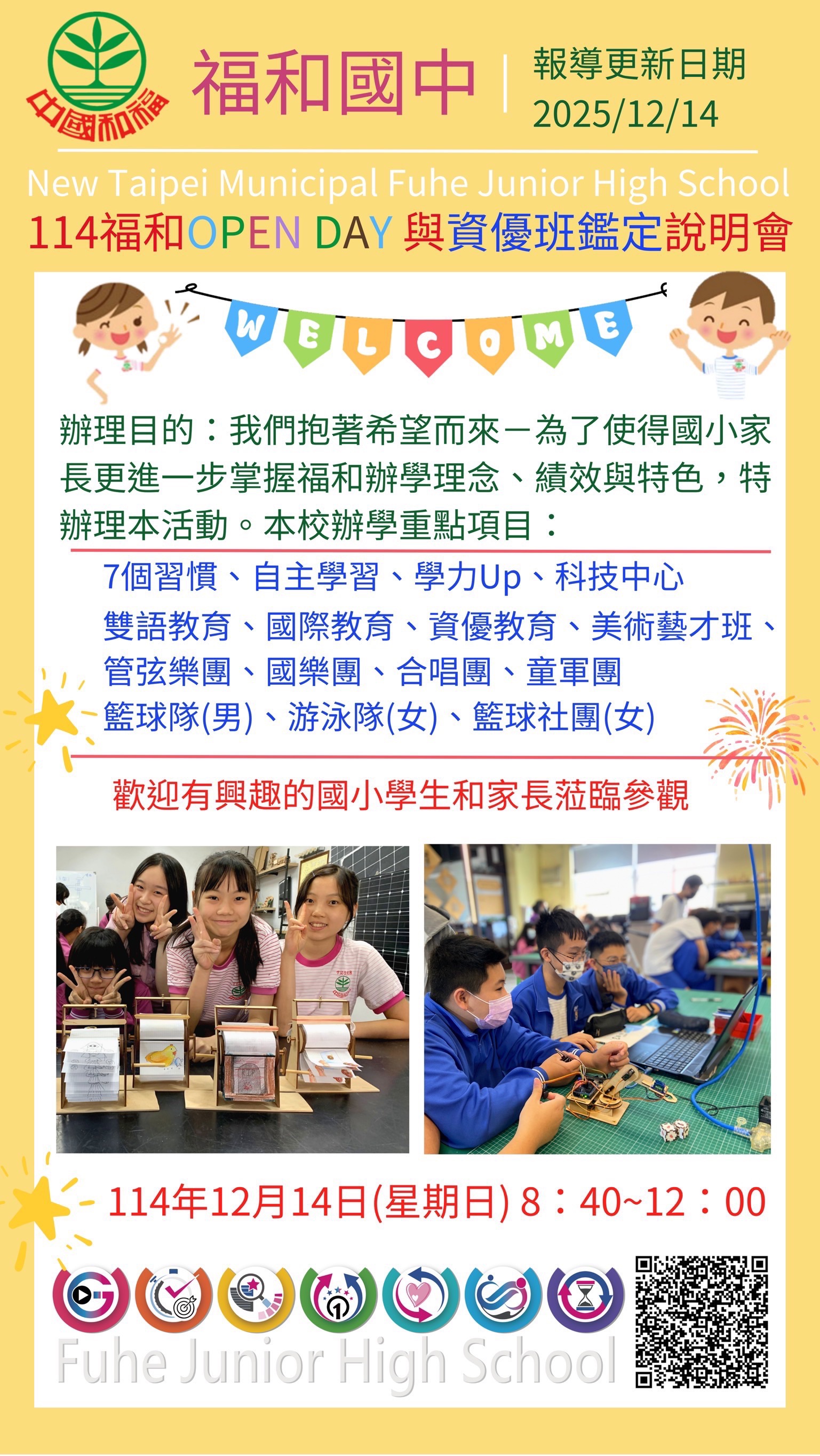 福和國中訂於114年12月14日(星期日)上午8:30-11:30舉辦School Open Day活動暨資優班招生說明會。