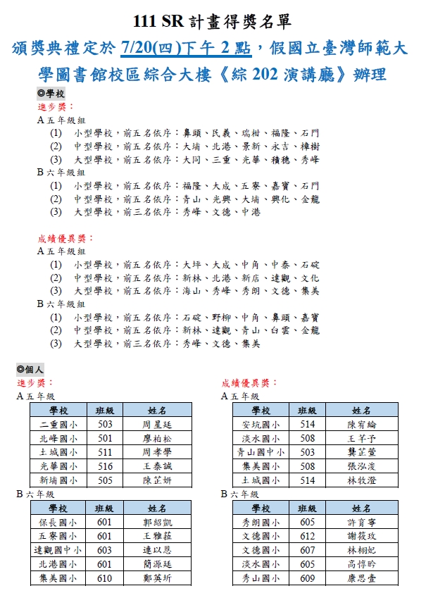 根據國立臺灣師範大學舉辦的111智慧適性閱讀(Smart Reading)計畫,本校五年級全體學生經由一學年的前測,閱讀及後測後,拿下全新北市進步獎第三名。